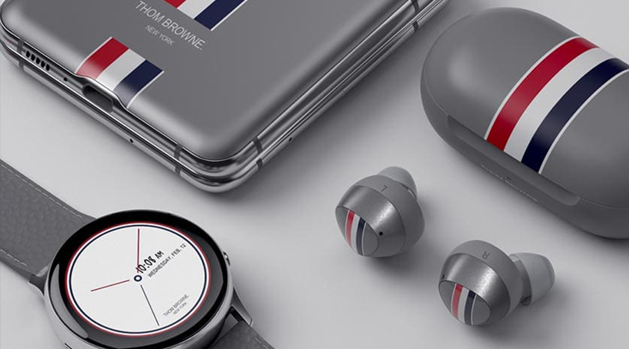 On February 14, Samsung launched the special edition on the US market for $2,480, compared to only $1,380 for the classic Galaxy Z Flip. Fortunately, the edition does not only justify its high price by its design inspired by Thom Browne. The foldable smartphone comes with a pair of Galaxy Buds+, Samsung's new wireless headphones, a Galaxy Watch Active 2, the brand's latest connected watch, and a luxury leather case. Unsurprisingly, all these accessories are stamped Thom Browne and proudly wear the designer's flagship colours.